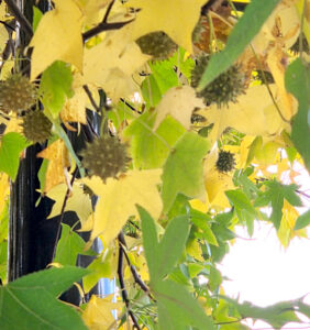 モミジバフウという木のようで、トゲトゲした丸い実がたくさんついています。